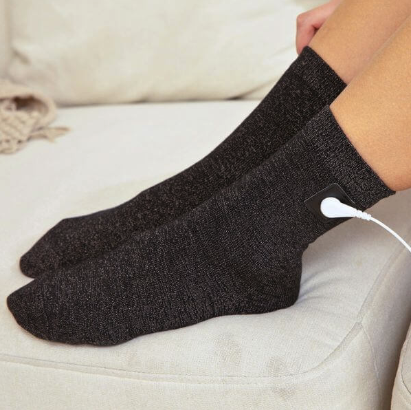 The socks are woven with 20% silver fibres, which makes them electrically conductive. That allows them to connect you to the earth’s grounding energy when you clip on the included cord. The silver content also gives them natural anti-bacterial and odor‑resistant properties.